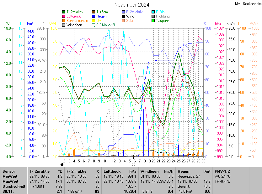 Der wärmste Tag war der 24.11.2024 um 14:55 mit 17.1°C. Am kältesten war es mit -1.9°C am 22.11.2024 um 06:30.