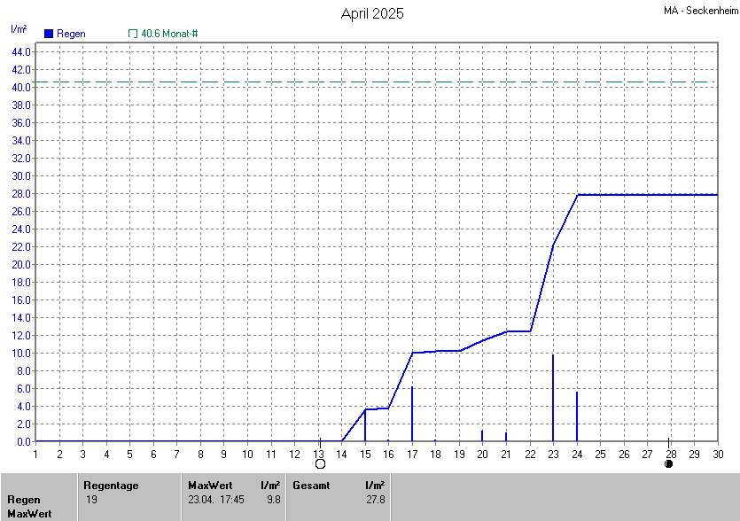 Der wärmste Tag war der 30.04.2025 um 16:25 mit 27.7°C. Am kältesten war es mit 0.7°C am 07.04.2025 um 06:45.